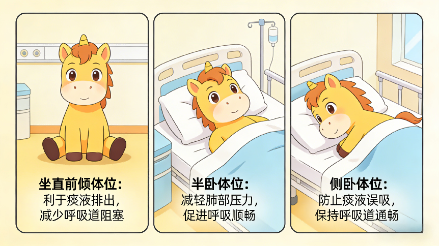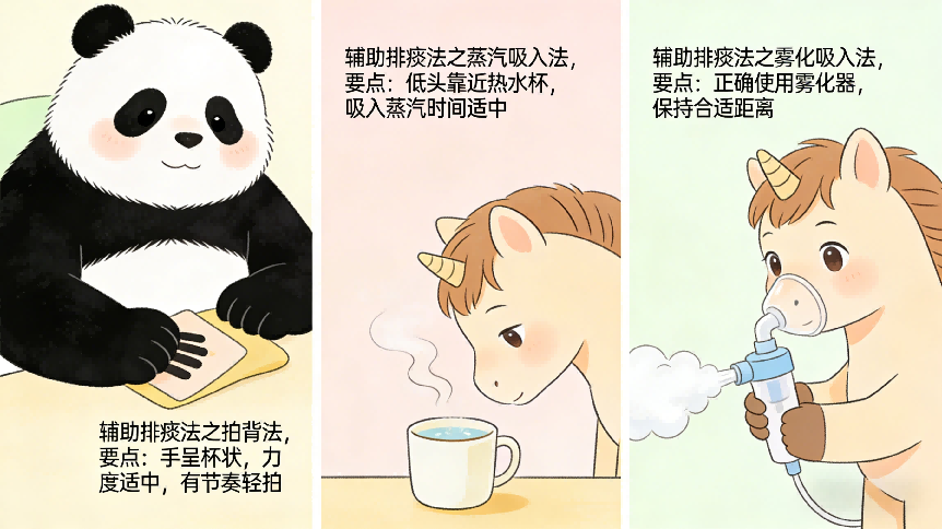 拍背排痰:请他人帮忙,手指并拢呈杯状,由下往上、由外向内轻拍患者背部,两侧肺部都要拍到,每次拍3-5分钟,每天2-3次。拍背力度以不引起疼痛为宜。