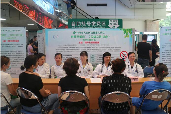 2019年5月31日是第三十二个世界无烟日,今年的主题为"烟草和肺部健康"。5月31日上午深圳市人民医院呼吸疾病研所医生和护长在门诊楼1楼举办了大型义诊惠民活动。