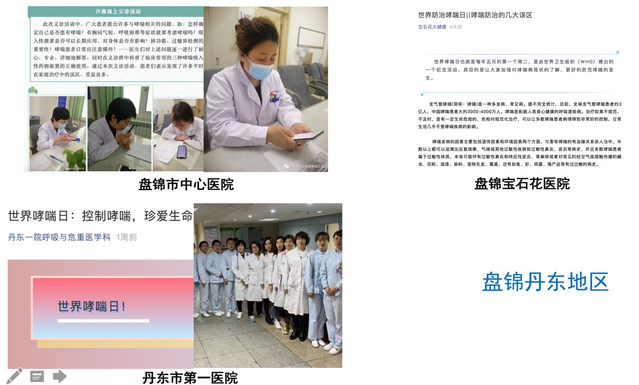 多年以来,辽宁省哮喘联盟在哮喘联盟的领导下,带领省内各级医院致力于哮喘的防治工作。5月5日以来,省内多个地区、多级医院积极响应号召,开展“世界哮喘日义诊宣传活动”。共有沈阳、大连、辽阳、抚顺、灯塔、本溪、丹东、锦州及盘锦等9个城市,沈阳北部战区总医院、中国医科大学附属第一医院、沈阳医学院附属中心医院、大连医科大学附属二院、大连大学附属新华医院、辽阳中心医院、辽阳第三人民医院、辽健集团抚矿总医院、抚顺市中心医院、灯塔市中心医院、本溪市中心医院、辽健集团本钢总医院、丹东市第一人民医院、锦州市第三人民医院、盘锦市中心医院、盘锦市宝石花医院等16家医院采取多元化的形式(通过公众号发表哮喘科普文章、视频直播哮喘相关知识讲座、在线视频宣传、微信群答疑、视频培训吸入装置使用方法及戒烟宣传等新颖的形式)开展患教活动,惠及群众2万余人。