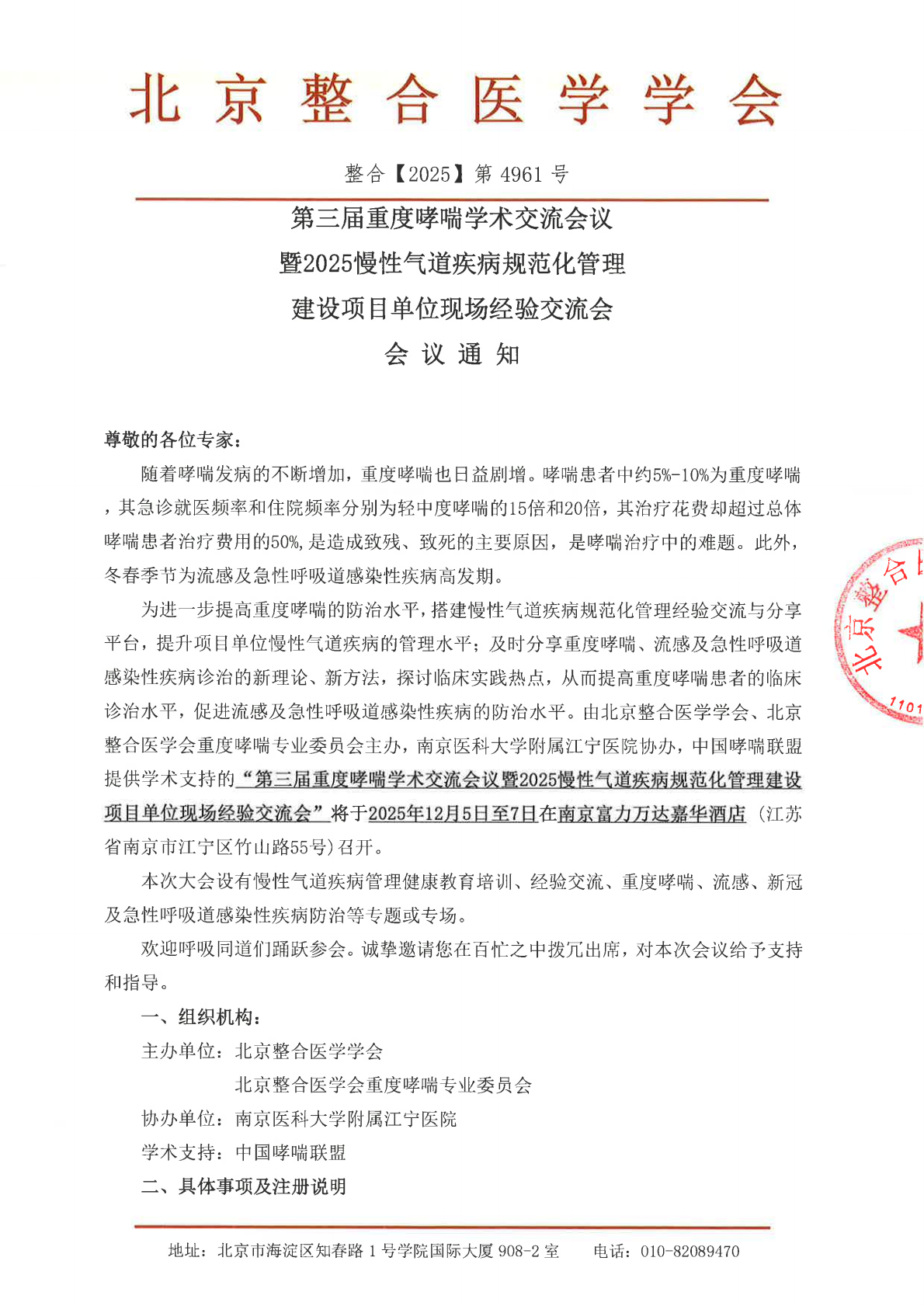 第三届重度哮喘学术交流会议暨2025慢性气道疾病规范化管理建设项目单位现场经验交流会会议通知