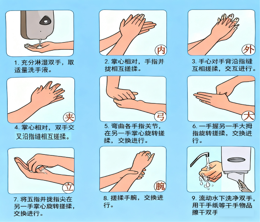 2.病菌最有可能通过眼鼻口进入体内,如果不得不触摸眼鼻口,请使用干净的纸巾或先洗手,使用肥皂或洗手液并用流动水按“七步洗手法”洗手,养成良好卫生习惯。