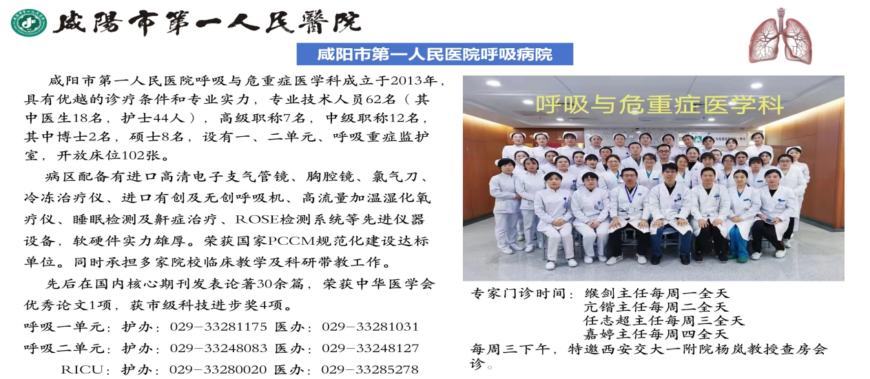 咸阳市第一人民医院呼吸与危重症医学科下设一、二单元、呼吸ICU。现有床位90张,医护人员60余人,主任医师2人、副主任医师6人、主治医师7人、住院医师3人、其中硕博9人。
